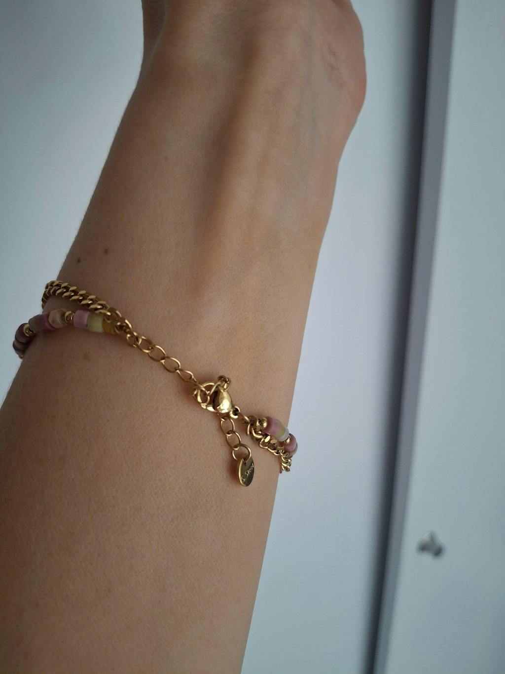 Bransoletka pozłacana z naturalnymi kamieniami różowy i cytrynowy jadeit Mys