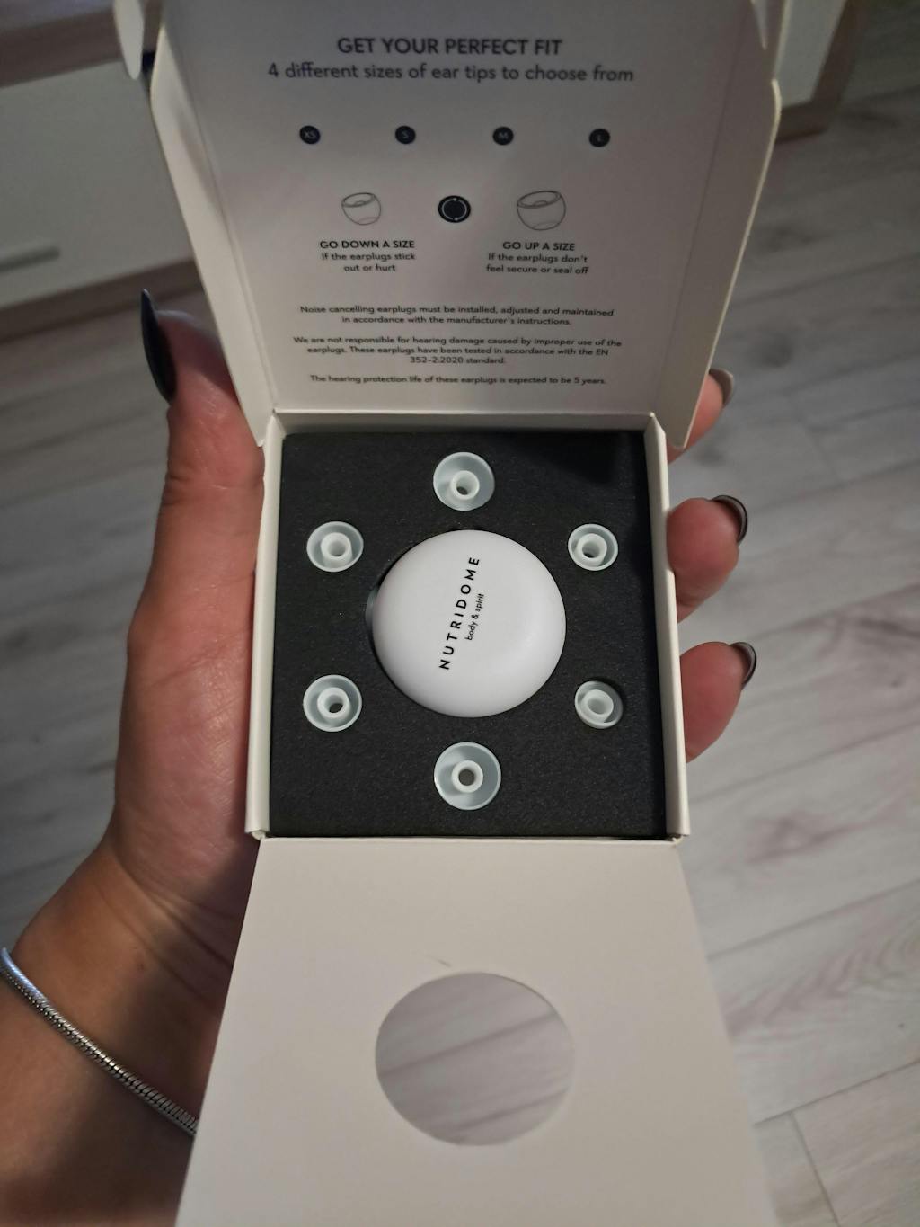 Zatyczki do uszu Nutridome pozwalają skoncentrować się na pracy i odpocząć od nadmiaru bodźców, jednocześnie chroniąc słuch w głośnym otoczeniu. Wybieraj spośród rozmiarów XS, S, M i L: jeśli stopery odstają lub uciskają, wybierz mniejszy rozmiar; jeśli nie czujesz stabilnego osadzenia i uszczelnienia, wybierz większy. Dzięki praktycznemu pudełeczku możesz je zawsze mieć pod ręką i bezpiecznie przechowywać, gdy akurat ich nie używasz.