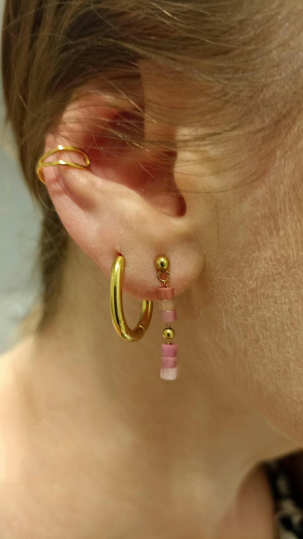 Biżuteria MYS łączy subtelny blask złota z ciepłym urokiem różowego jadeitu. W komplecie znajdziesz dwie pary kolczyków – klasyczne kółeczka, ozdobne kolczyki z różowym jadeitem w kilku odcieniach oraz stylową nausznicę, która dodaje całości nowoczesnego charakteru. To propozycja dla kobiet, które cenią naturalne kamienie i nieoczywiste dodatki.